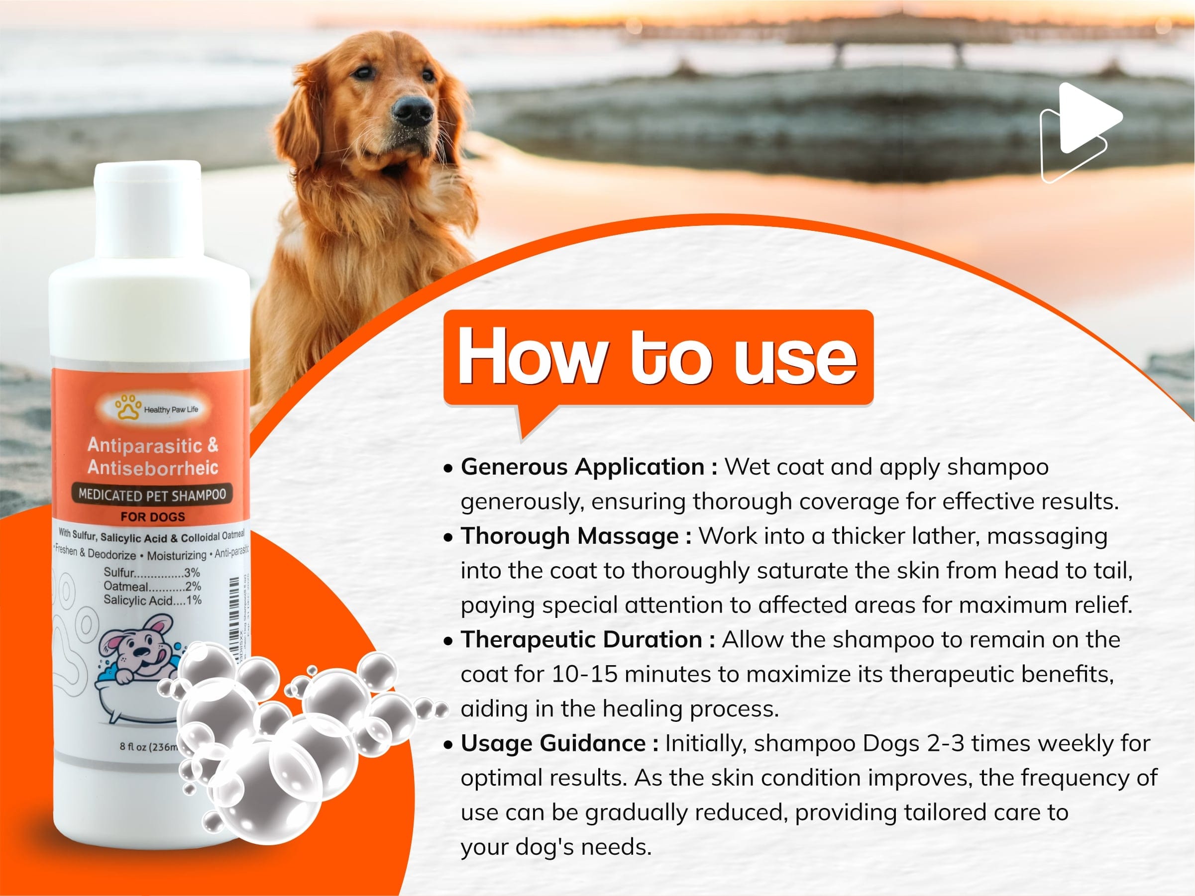 Wet coat and apply shampoo generously. Work into a lather, massaging into the coat to thoroughly saturate skin. Allow to remain on pet for 10-15 minutes. Rinse well. Initially, shampoo pet for 2-3 times weekly. As skin condition improves, frequency of use can be reduced.